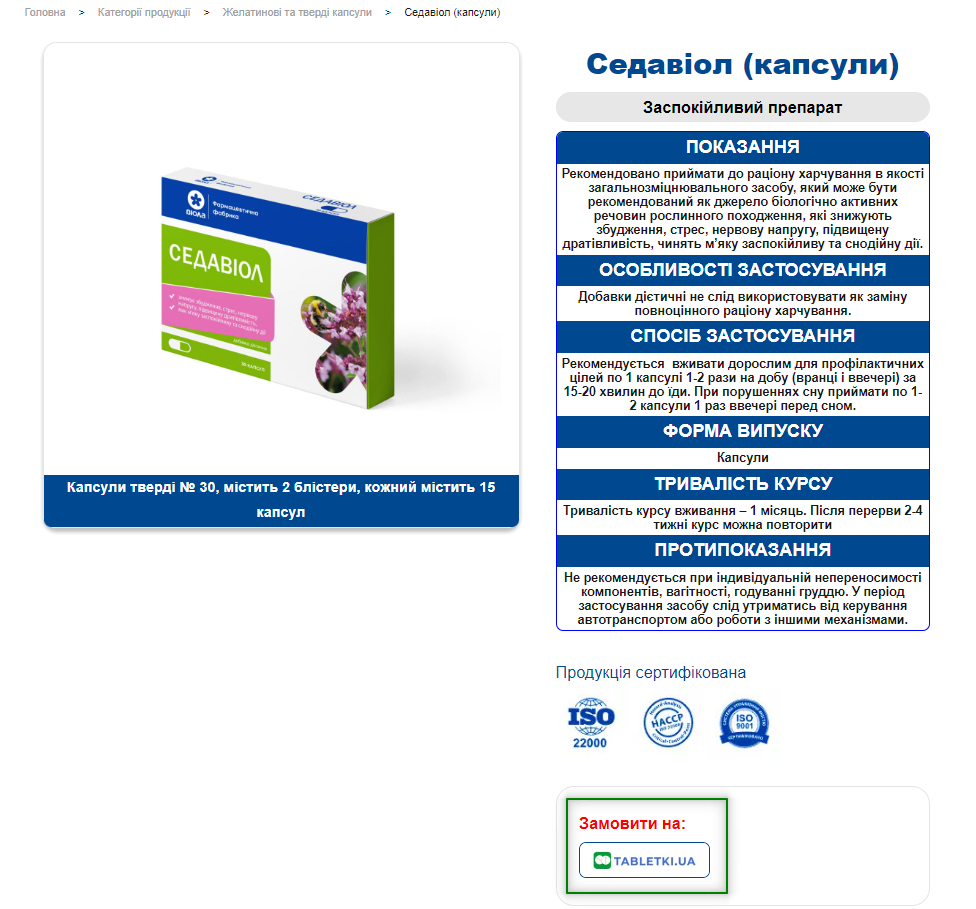 На сайті представлений каталог продукції з детальним описом кожної позиції та посиланням на її сторінку у сервісі бронювання ліків.
