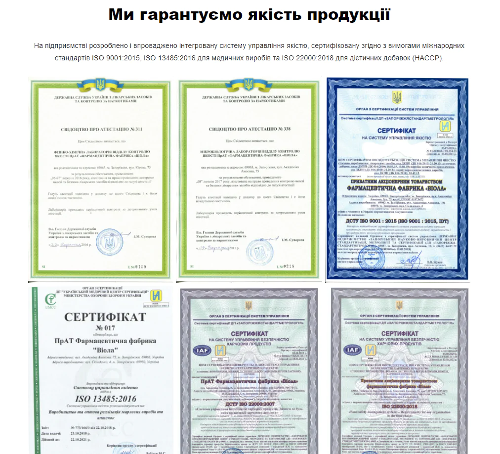 Також є детальна інформація про компанію, виробництво, співпрацю та всі необхідні документи, що дуже важливо при просуванні медичних сайтів.