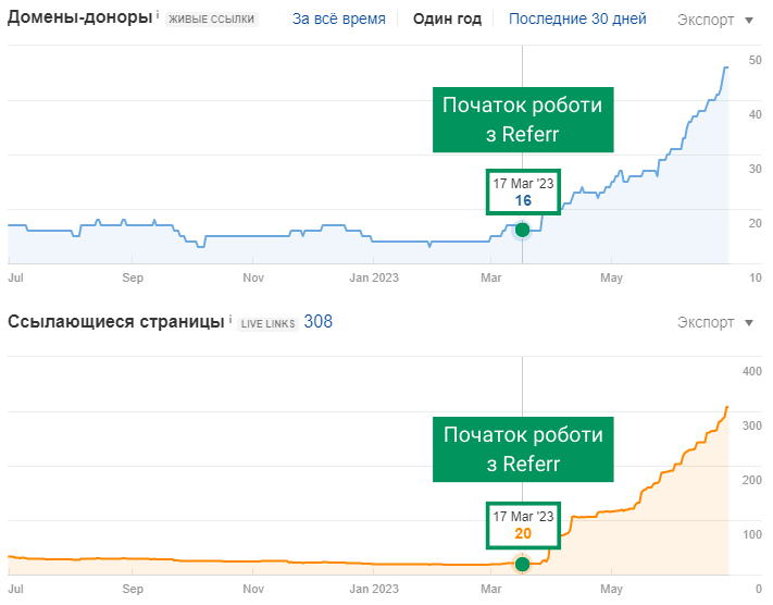 Всього за 3 місяці роботи з Referr вдалося задати позитивну динаміку посилальному профілю інтернет-магазину електроніки, створити правильний анкор лист, а також збільшити DR з 1 до 17 згідно з Ahrefs, загальну кількість доменів-донорів з 16 до 46 та беклінків з 20 до 308: