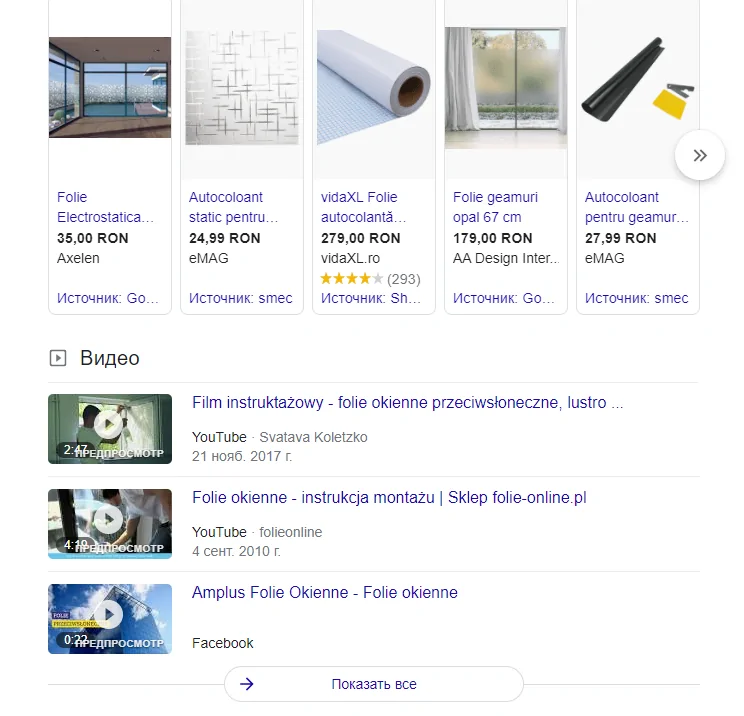 - Сніпети у видачі. Частина видачі за ключовими запитами зайнята візуальними сніпетами з каталогів та тематичними відео.