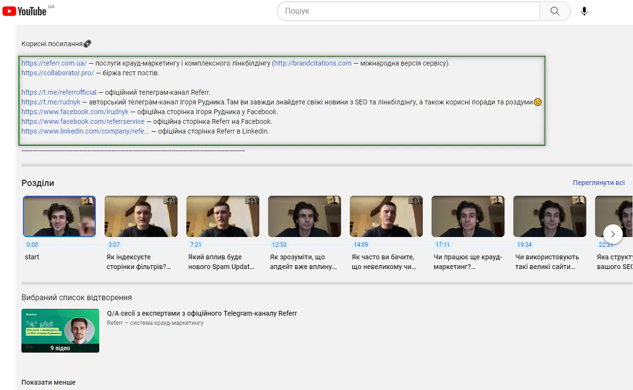 Еще более труднореализуемый, но эффективный метод — получение ссылки под видео на Youtube, Vimeo и т.д. Сложность его в том, что для размещения ссылки необходимо создать как минимум один видеоролик (лучше полезный).