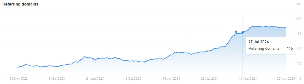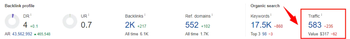 Ссылочный профиль сайта: DR по Ahrefs 3, 415 уникальных доменов-доноров, 2К+ ссылок, 583 посетителя в месяц.