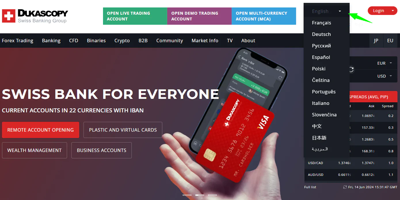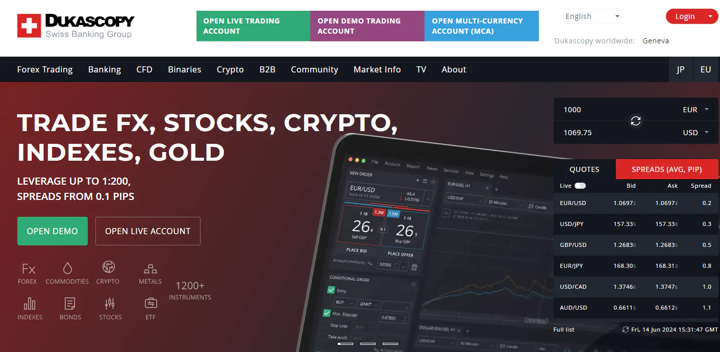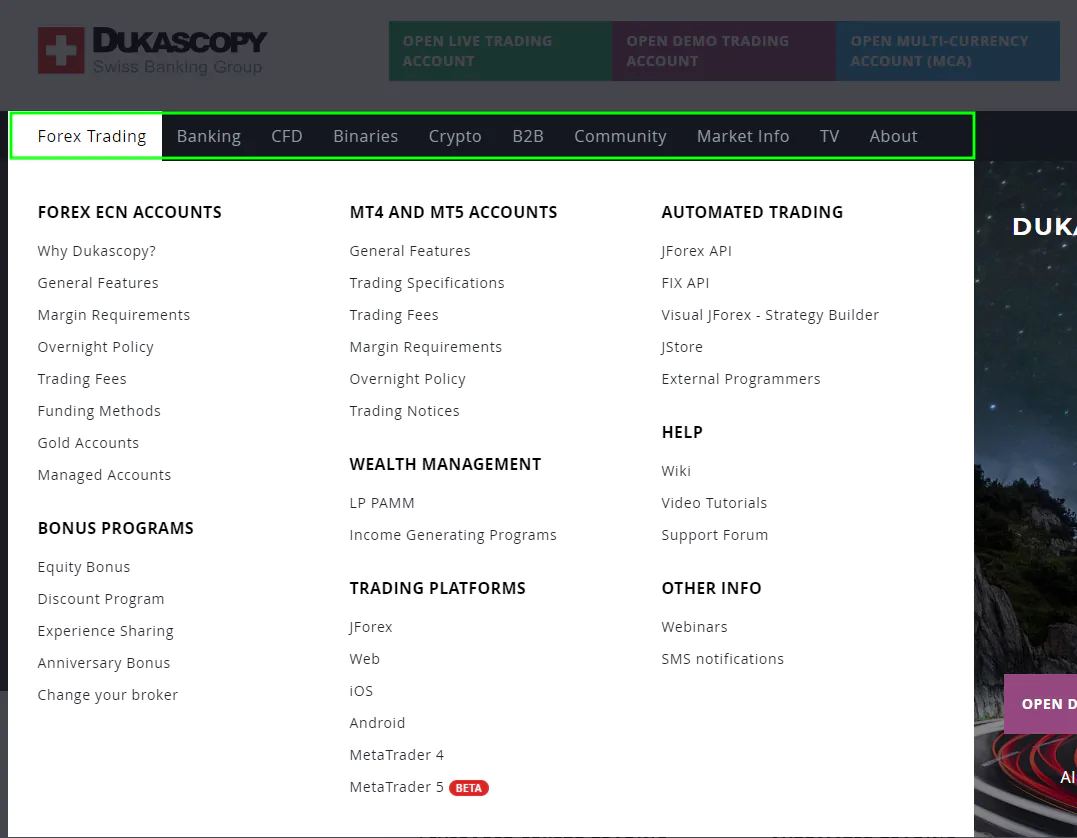 - Широкий функционал. Здесь вы найдете банковские услуги, форекс, крипту, CFD, бинарные опционы, спецпредложения для B2B. На сайте много информации о фин рынке: статьи, новости, обзоры, технический анализ, торговые инструменты и пр. Есть калькулятор обмена валют, виджет SWFX и даже Dukascopy TV.