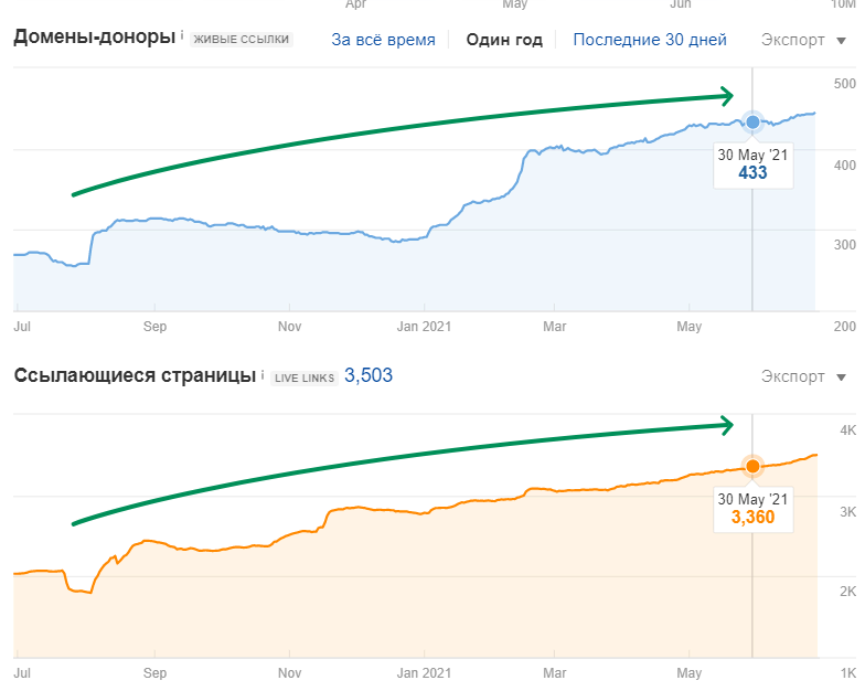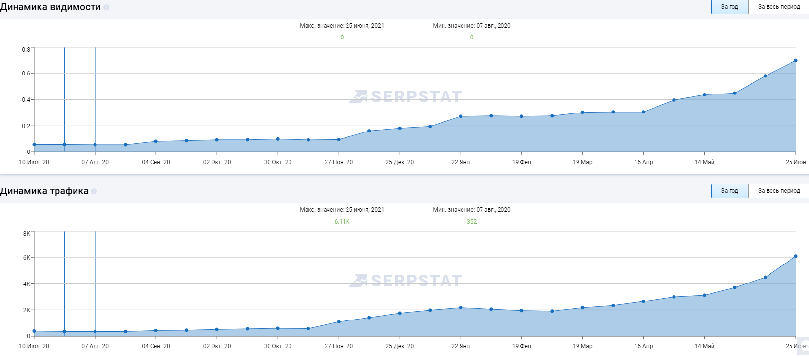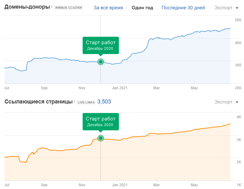Как видим на графиках — мы внесли свой вклад в создание планомерного роста динамики ссылочного профиля проекта и увеличение присутствия проекта в выдаче по поисковым запросам. На данный момент работа Referr с проектом остановлена.