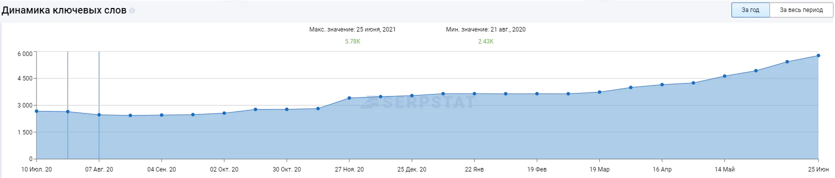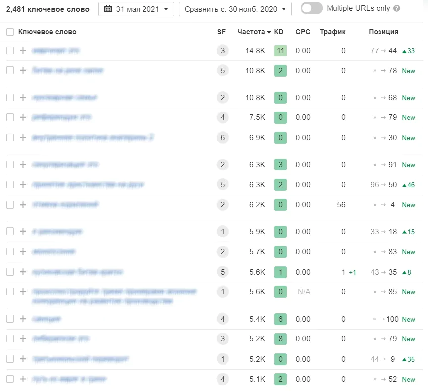 Также наблюдаем существенный рост позиций сайта и добавление новых ключевых запросов в профиль.