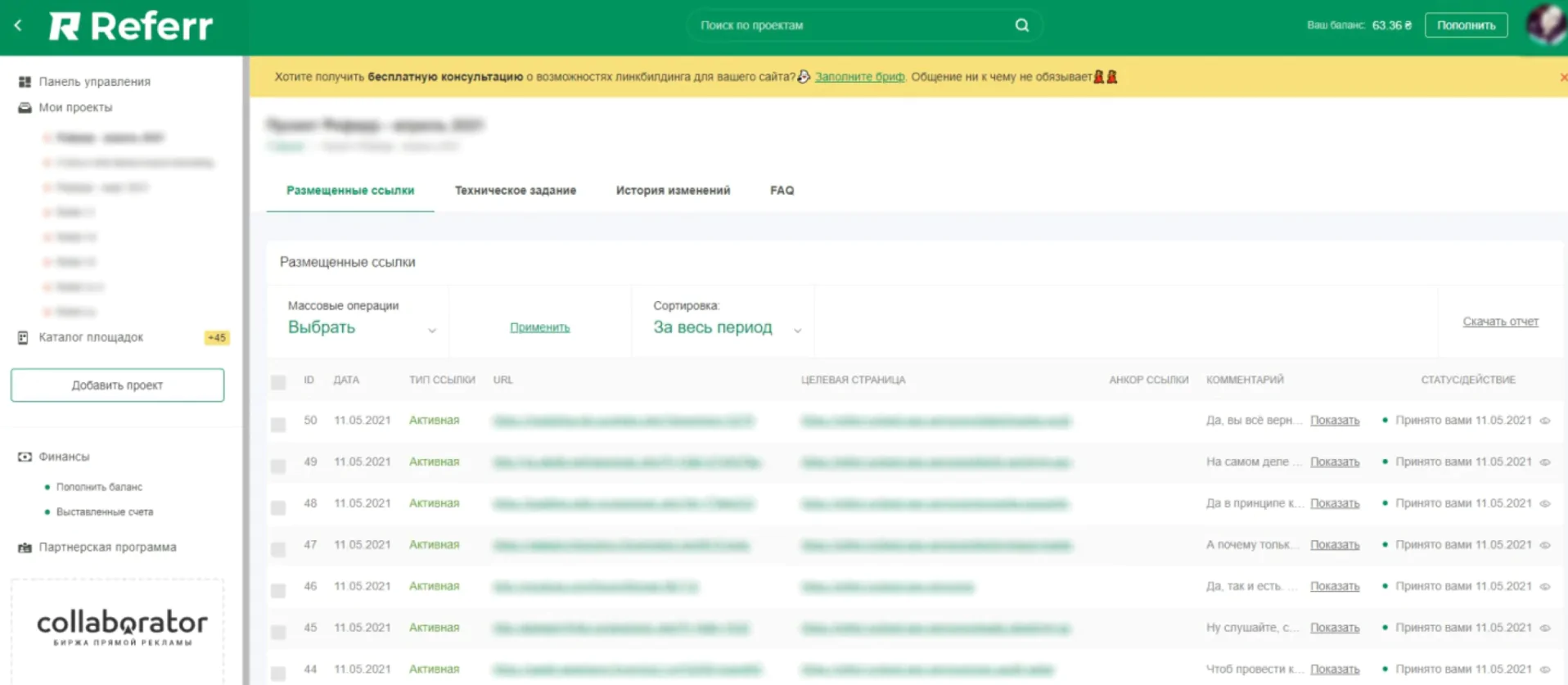 Вся работа по одобрению/доработкам размещенных ссылок велась в личном кабинете.