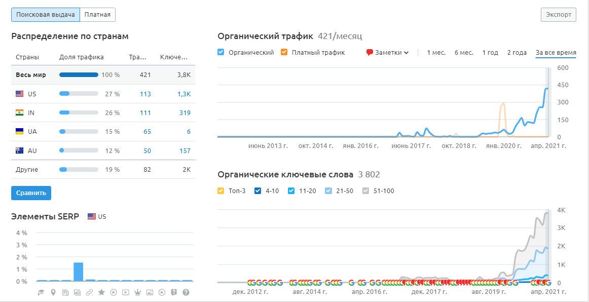 Рост количества органических ключевых слов и принадлежность к целевому региону