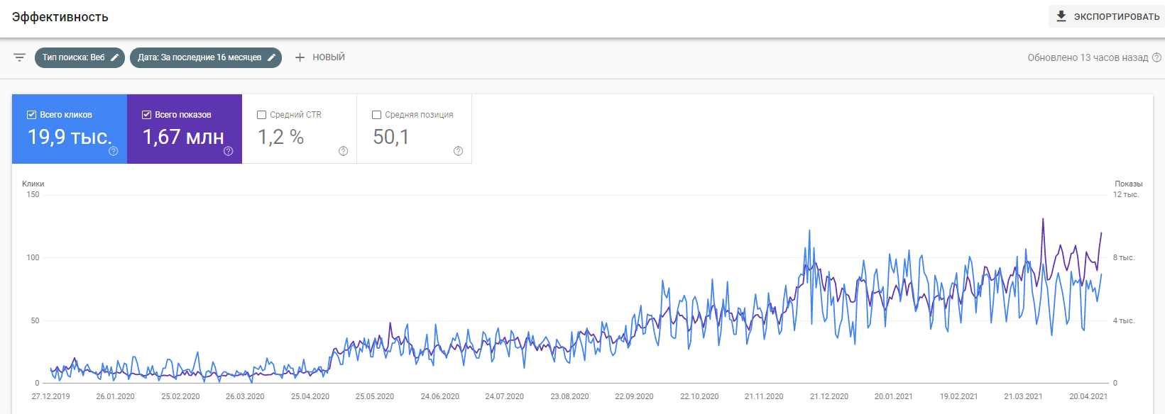 Спустя год после сотрудничества, благодаря накопленной ссылочной массе и другим проведенным работам, SEO-трафик на проекте вырос с 400 посетителей в месяц до 1900 посетителей в месяц и стал составлять 50% от общего трафика (на начало продвижения по новой стратегии занимал 25%). Стал самым быстрорастущим каналом трафика, соответственно лидогенерация от этого канала выросла на 30% (sales qualified leads) за тот же период.