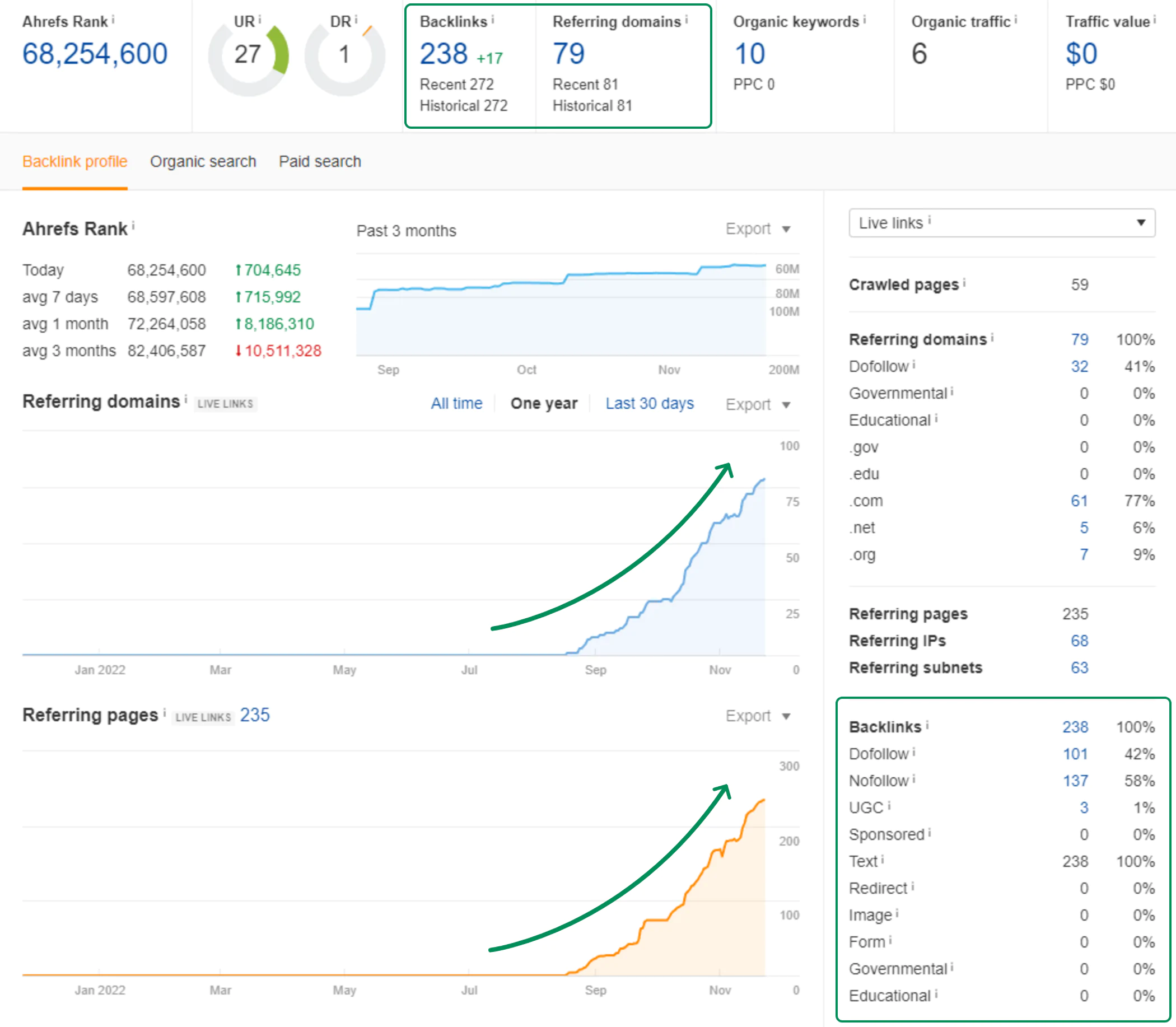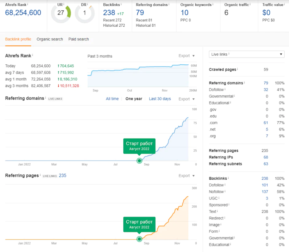 Добавили в профиль 79 уникальных доменов и 238 ссылок различных типов (dofollow/nofollow). А также задали положительную динамику ссылочной массы сайта.