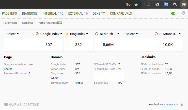 SEOQuake — расширение браузера Google Chrome, которое предоставляет полную информацию по поисковой оптимизации, проводит SEO-аудит веб-ресурса, составляет отчеты по внешним и внутренним ссылкам.