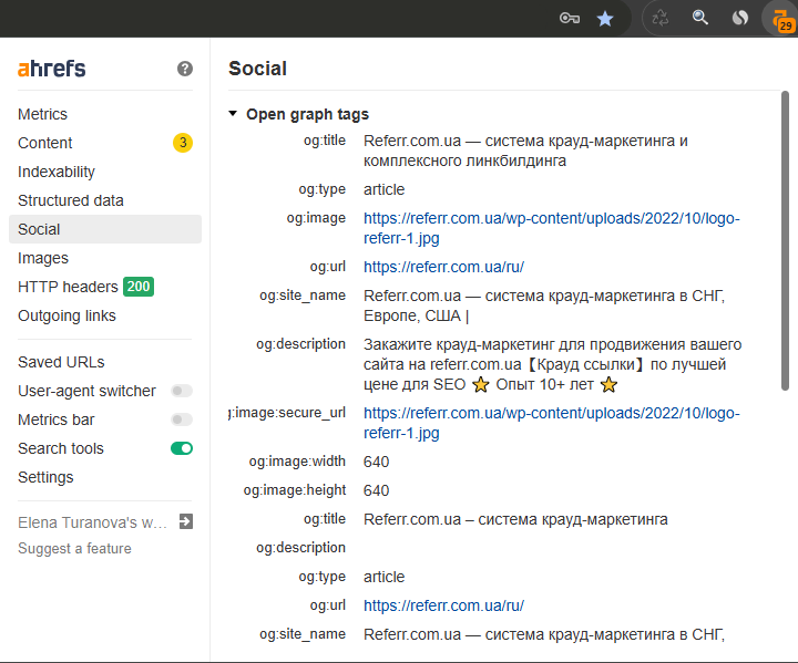 - Отчет по SEO на странице. Показывает метатеги, даты, количество слов, подзаголовки, индексируемость и т. д.