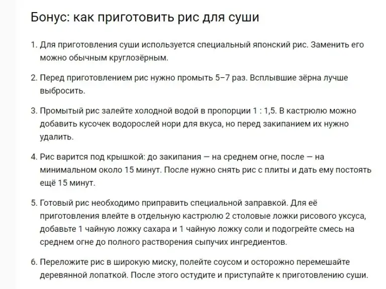 Списки всегда визуально выделяются в тексте и особенно выигрышно смотрятся в объемных статьях. Много списков не бывает, но использовать их нужно с умом и по делу. Например, перечисление из двух пунктов смотрится слегка нелепо.